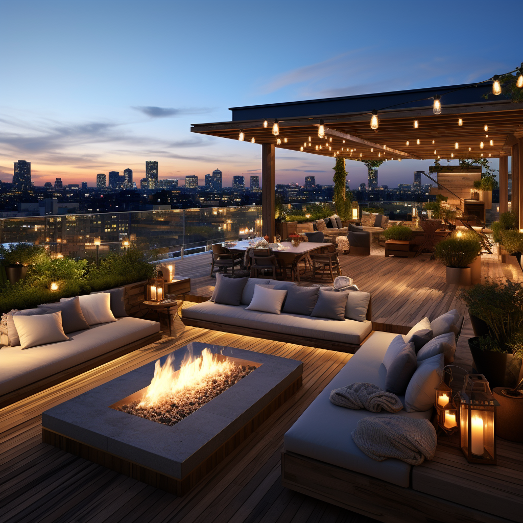 도심 스카이라인의 전경을 볼 수 있는 고요한 옥상 라운지로 식물과 아늑한 모닥불이 포함되어 있어 손님들이 긴장을 풀 수 있습니다.