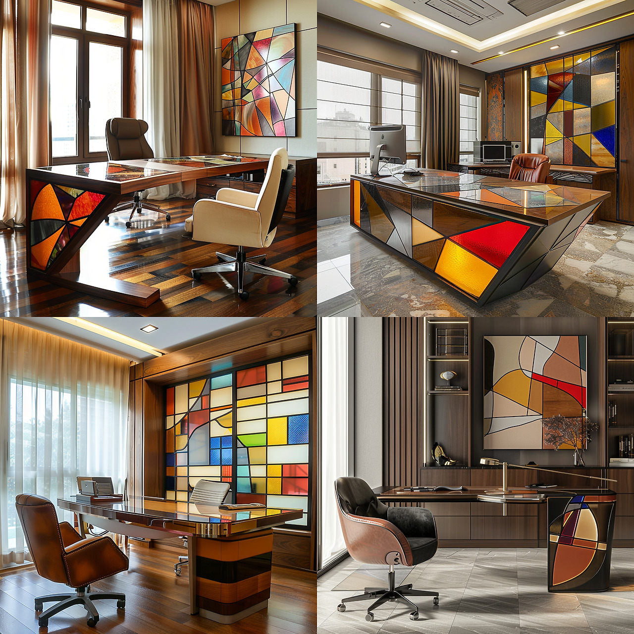 The Photography interior design of Office in Cubist style with Stained glass Executive Desk, Twill fabric Office Chair and Synthetic leather Drafting Table --q 1 --ar 1:1