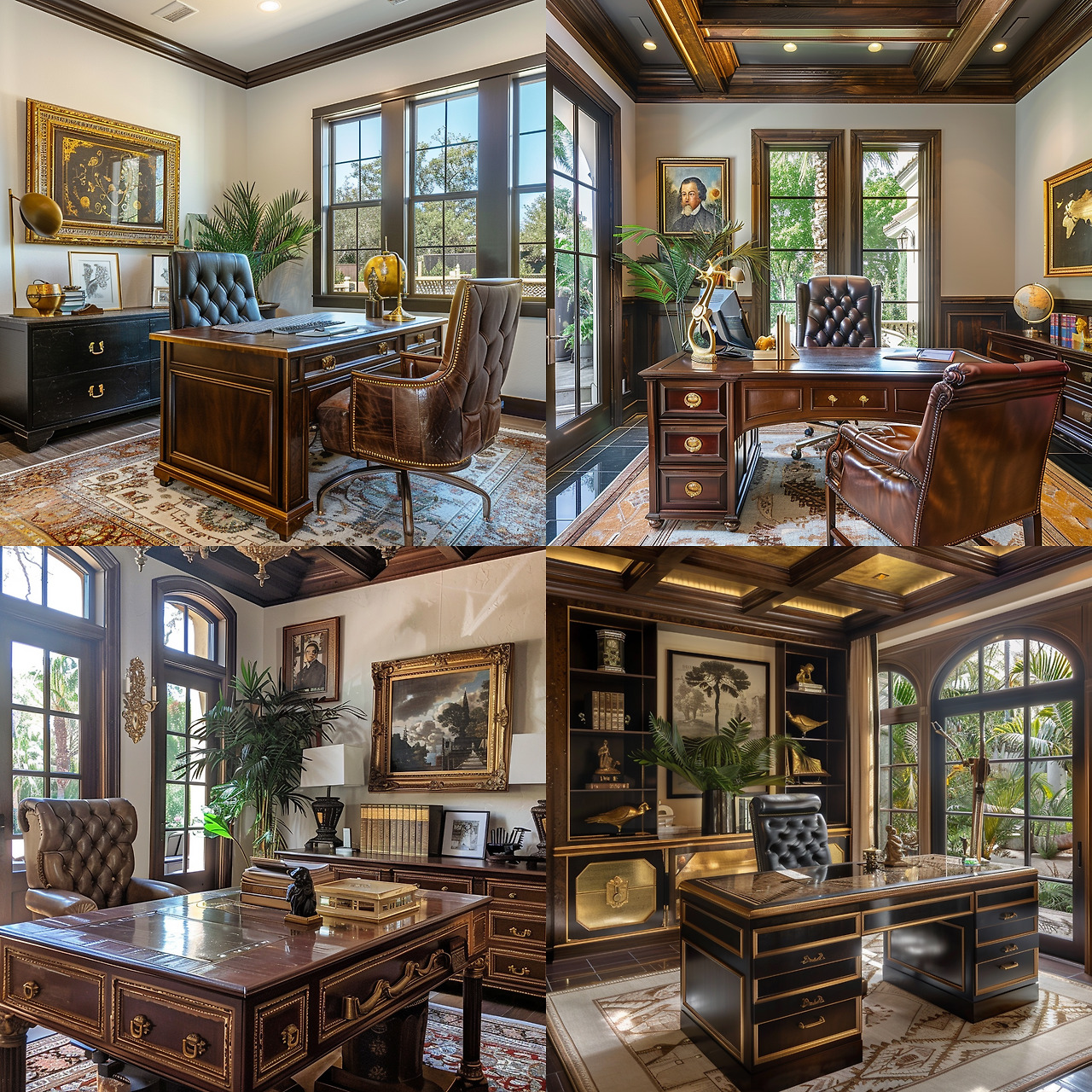 The Photography interior design of Office in Spanish Revival style with Faux leather Executive Desk, Flannel Office Chair and Gold leaf Writing Desk --q 1 --ar 1:1