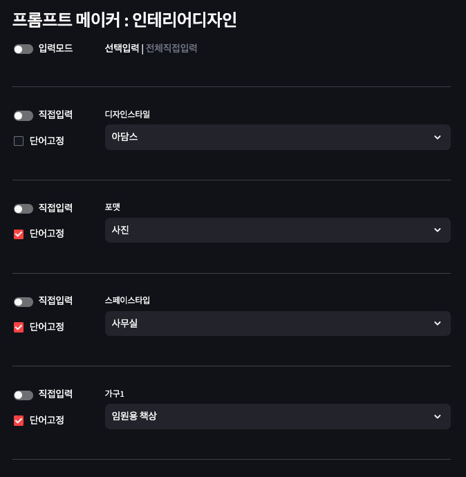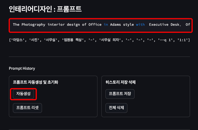 사무실 인테리어 디자인을 위해서는 메뉴중 특정 요소, 즉 스페이스 타입과 가구를 사무실에 맞는 아이템을 선택해서 고정하고, 자동 생성을 눌러주면 다양한 스타일의 인테리어 디자인을 위한 프롬프트가 만들어집니다. 이 프롬프트를 미드저니에 넣어주면 바로 디자인을 얻을 수 있습니다.