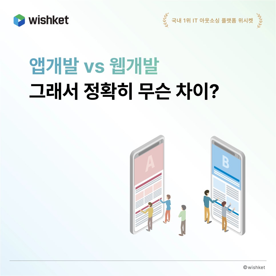 비슷해 보이지만, 큰 차이를 보이는 앱(app)과 웹(web)의 차이. 포털사이트에서도 둘 사이 전향을 고민하는 개발자들의 고민을 어렵지 않게 볼 수 있는데요. 둘의 차이가 대체 어떻길래, 개발업계는 둘을 다른 영역으로 보고 있는 걸까요? 위시켓이 앱개발과 웹개발의 차이를 가장 쉽게 설명해 드립니다. 아래를 보고 우리 회사에는 앱개발과 웹개발 중 어떤 방식을 채택해야 할지 선택의 방향을 가늠해 보세요.