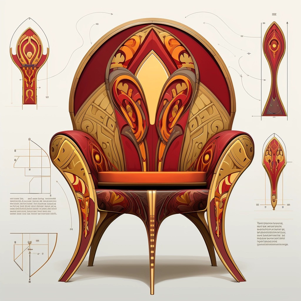 Design a package for Beautifully Designed Chair in a Organic Architecture style inspired by the art of Faith Ringgold, Burgundy and gold color scheme