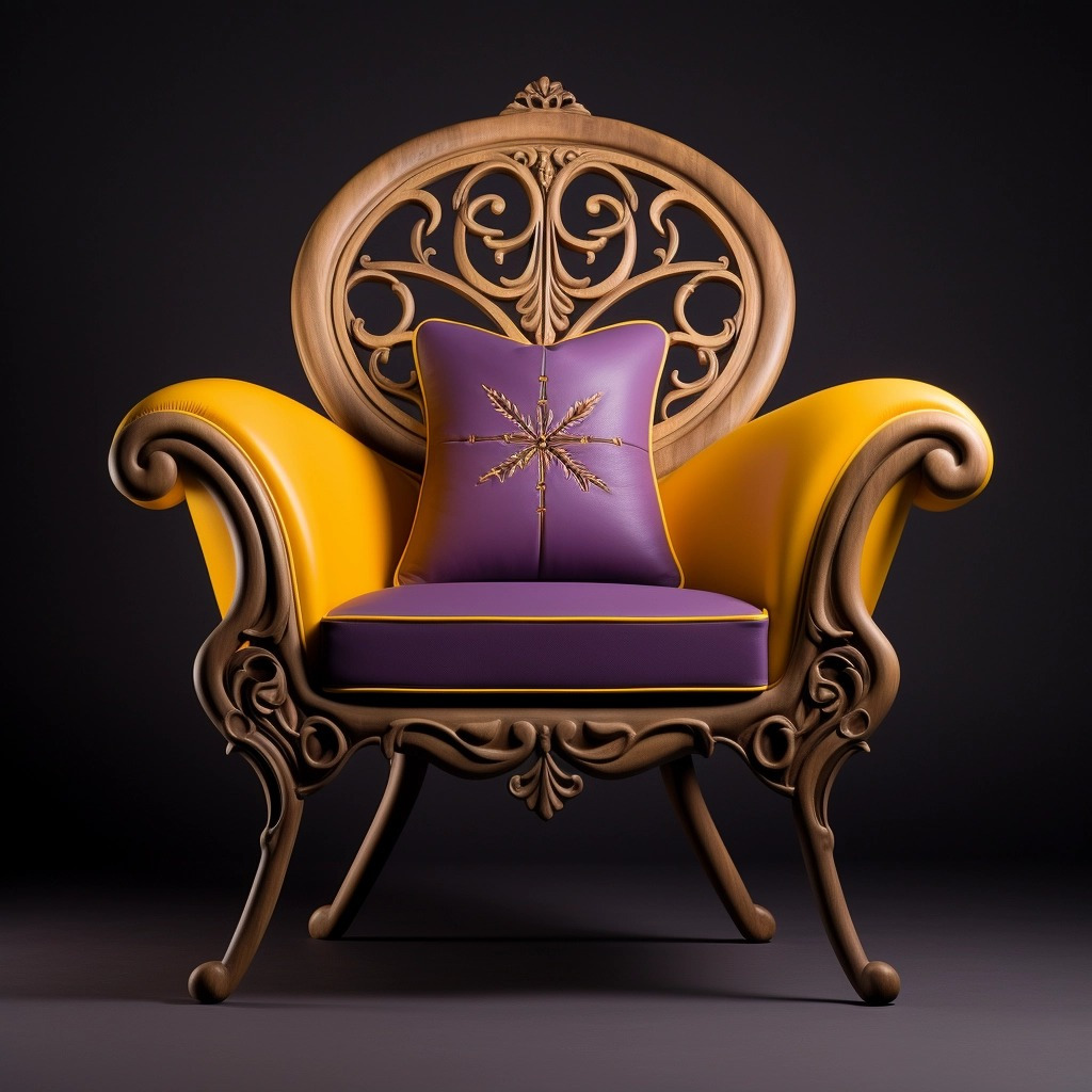 Design a package for Beautifully Designed Chair in a Byzantine style inspired by the art of Titian, Lilac and butter yellow color scheme