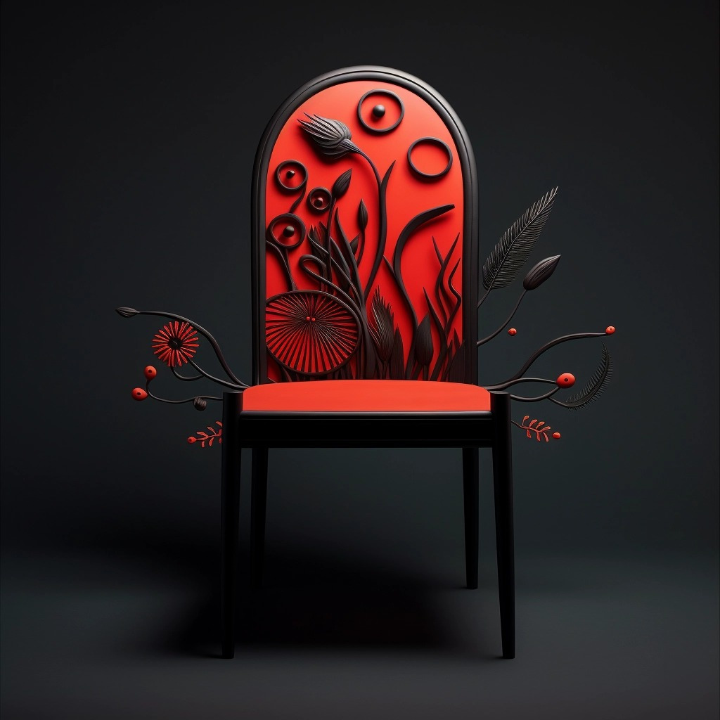 Design a package for Beautifully Designed Chair in a Brutalist style inspired by the art of Henri Rousseau, Black and crimson color scheme