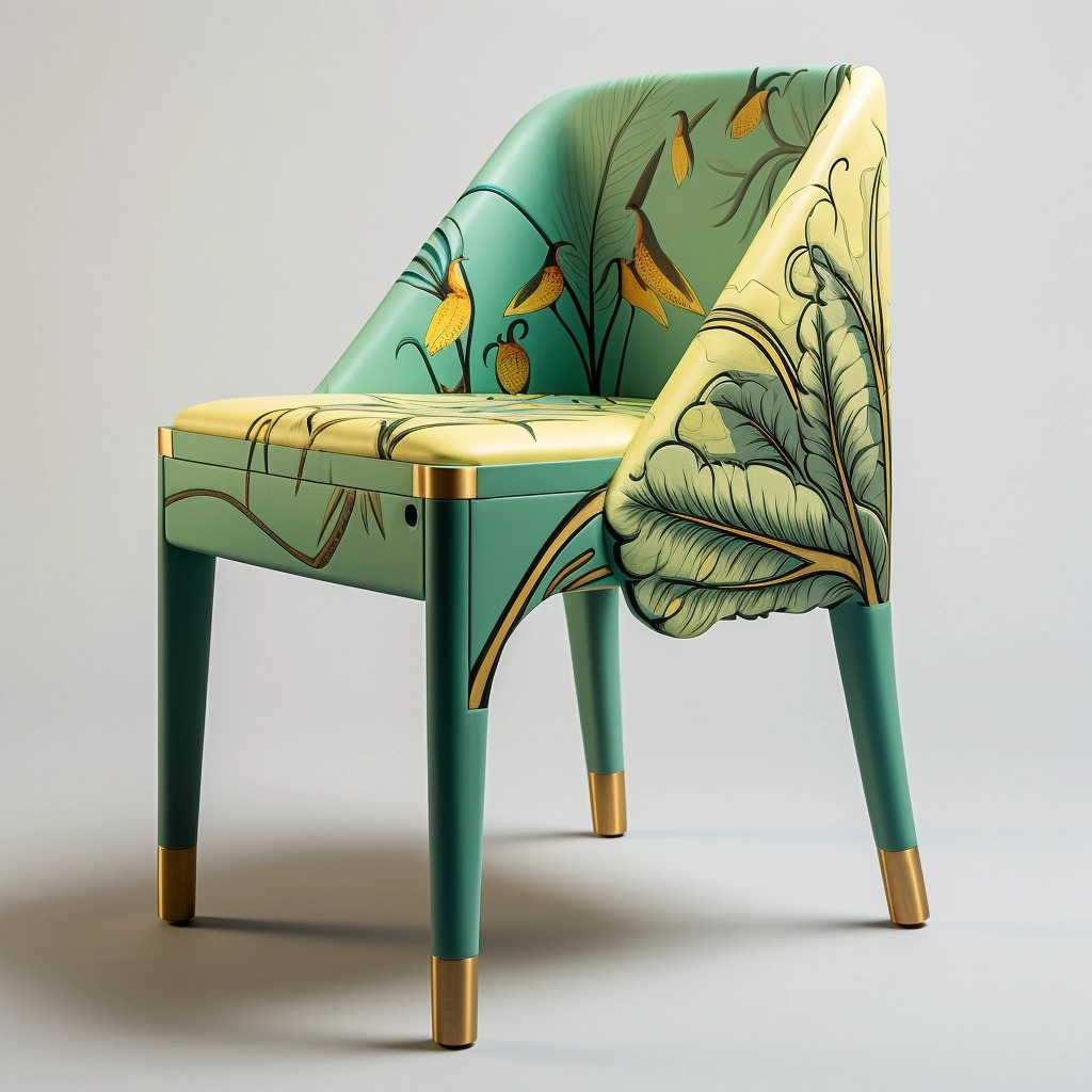 Design a package for Beautifully Designed Chair in a Postmodern style inspired by the art of Henri Rousseau, Mint and gold color scheme