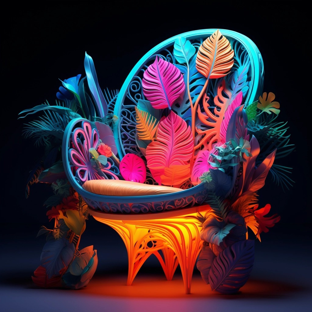 Design a package for Beautifully Designed Chair in a Tropical style inspired by the art of Yoko Ono, Neon color scheme