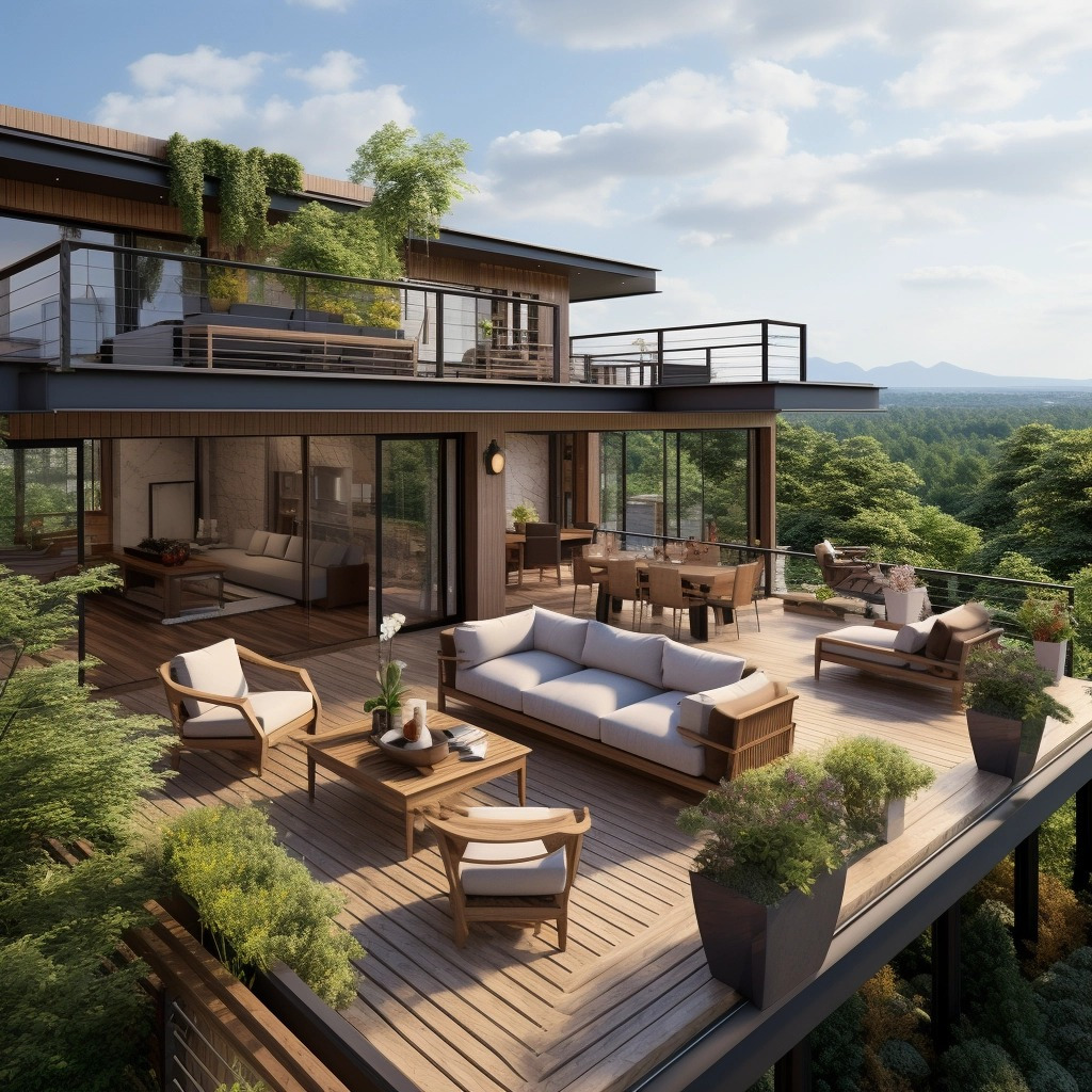 2024년에는 거실 공간을 발코니, 옥상, 높은 데크까지 확장하는 디자인으로서 고층 야외 공간이 인기를 얻고 있습니다. 이러한 공간은 고요한 전망과 휴식 및 오락을 위한 추가 공간을 제공하며 야외 활동과 여가를 중시하는 라이프스타일을 반영합니다.