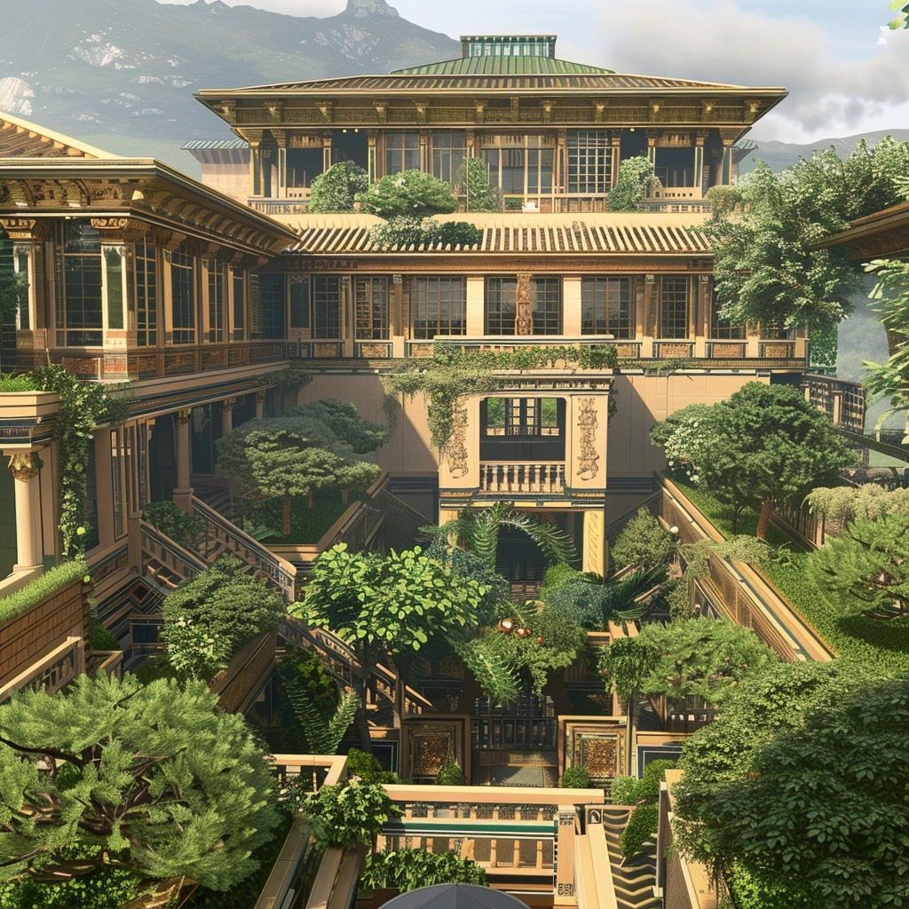 A Old Japanese Castle of a Matrix View in a Egyptian Revival style, with Balcony gardens. Rendered in Blender by Charles Rennie Mackintosh,