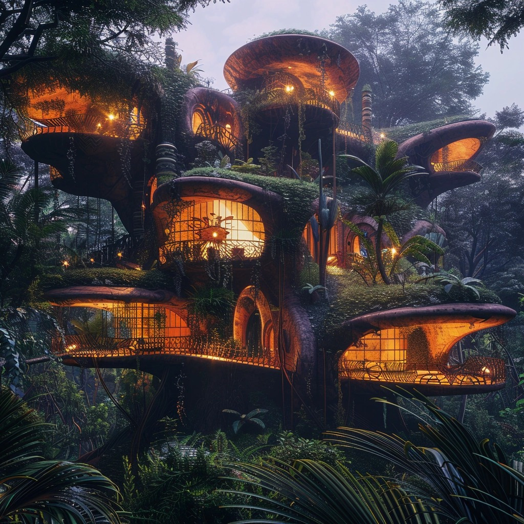 이 프롬프트는 미드저니가 처리할 수 있는 디테일의 수준을 보여줍니다. 최첨단 디자인과 자연 요소를 완벽하게 혼합한 미래 지향적인 건축을 시각화할 수 있습니다.
