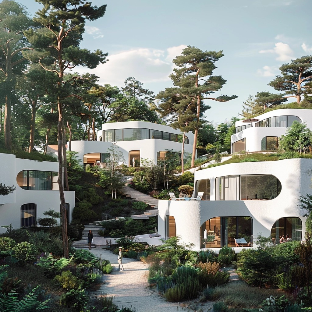 Architecture illustration of white designer houses in hill in forest with lots of vegetation, bushes, trees, happy people walking and enjoying sunshine, scandinavian design, contemporary architecture, white houses, modern, futuristic, trees, photorealistic, v-ray tracing, ultra detailed, octane render.