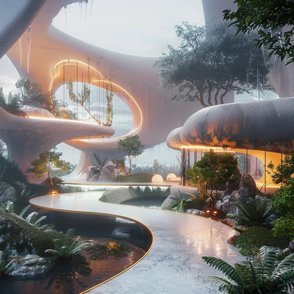이 프롬프트는 최첨단 건축 디자인과 자연 환경을 완벽하게 혼합하여 혁신과 지속 가능성을 구현하는 친환경 컨셉을 만들어내는 미드저니의 능력을 보여줍니다.