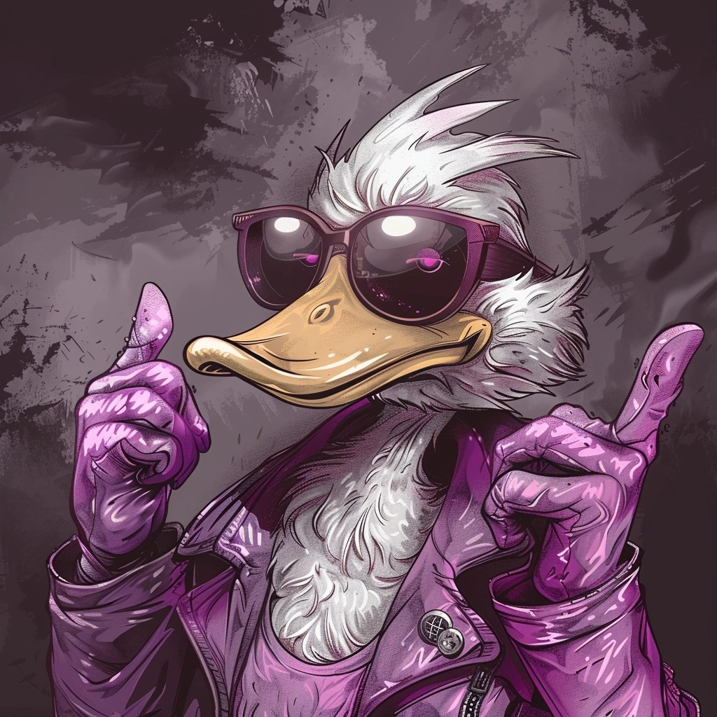 Hand-Drawn Character illustration of duck, Gesture, Devilcore, Purple, Pink, and White, Charcoal background