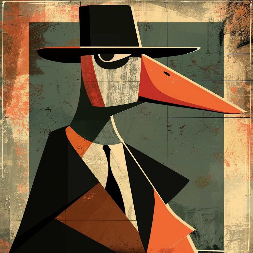 Flat Character illustration of duck, Colorful animation stills, Film noir style, Rust, Cream, and Black, Coral background