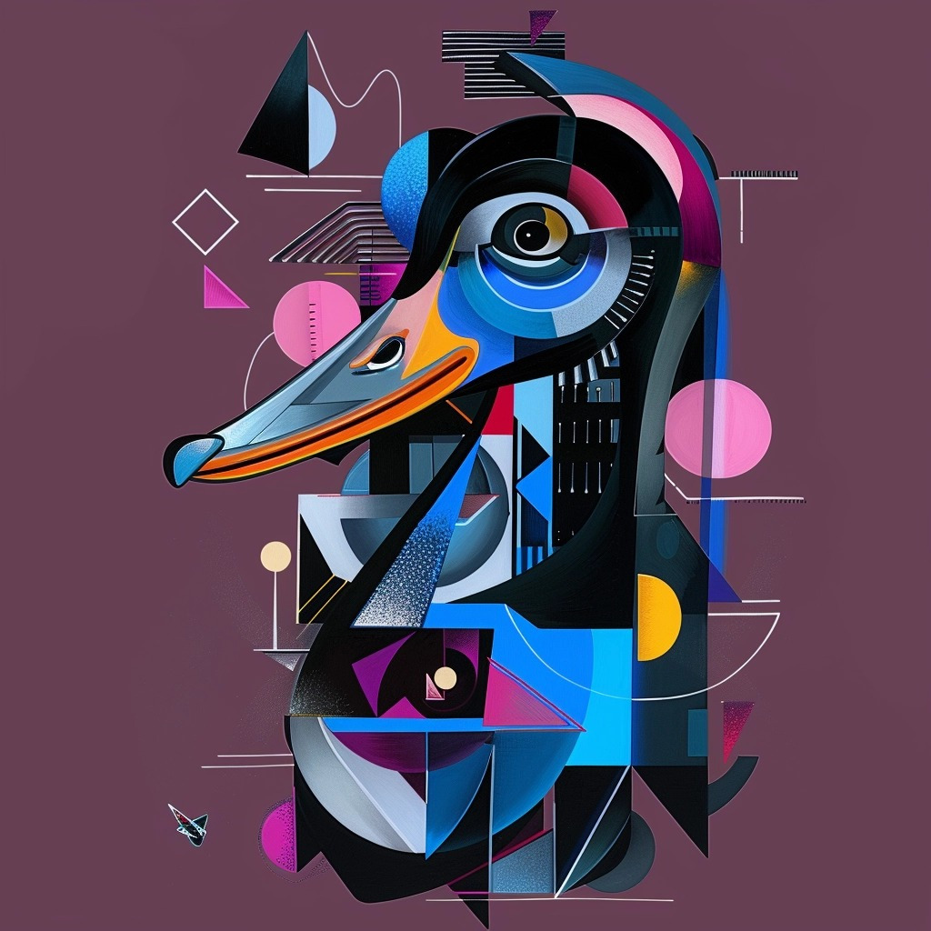 Geometry Character illustration of duck, Charming characters, DMT art style, Electric Blue, Black, and Silver, Mauve background