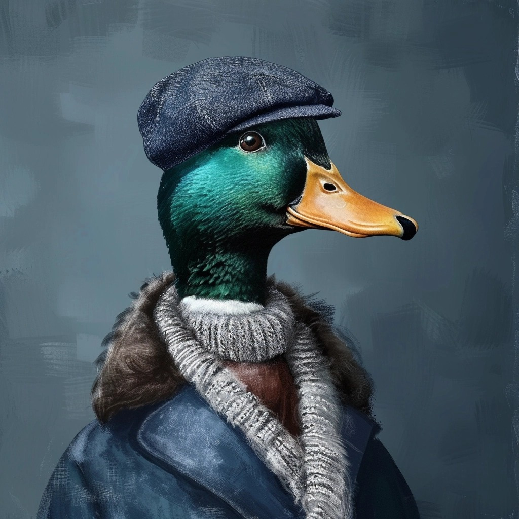 Hand-Drawn Character illustration of duck, Hyperrealistic rendering, Romantic academia, Teal, Gray, and White, Navy blue background