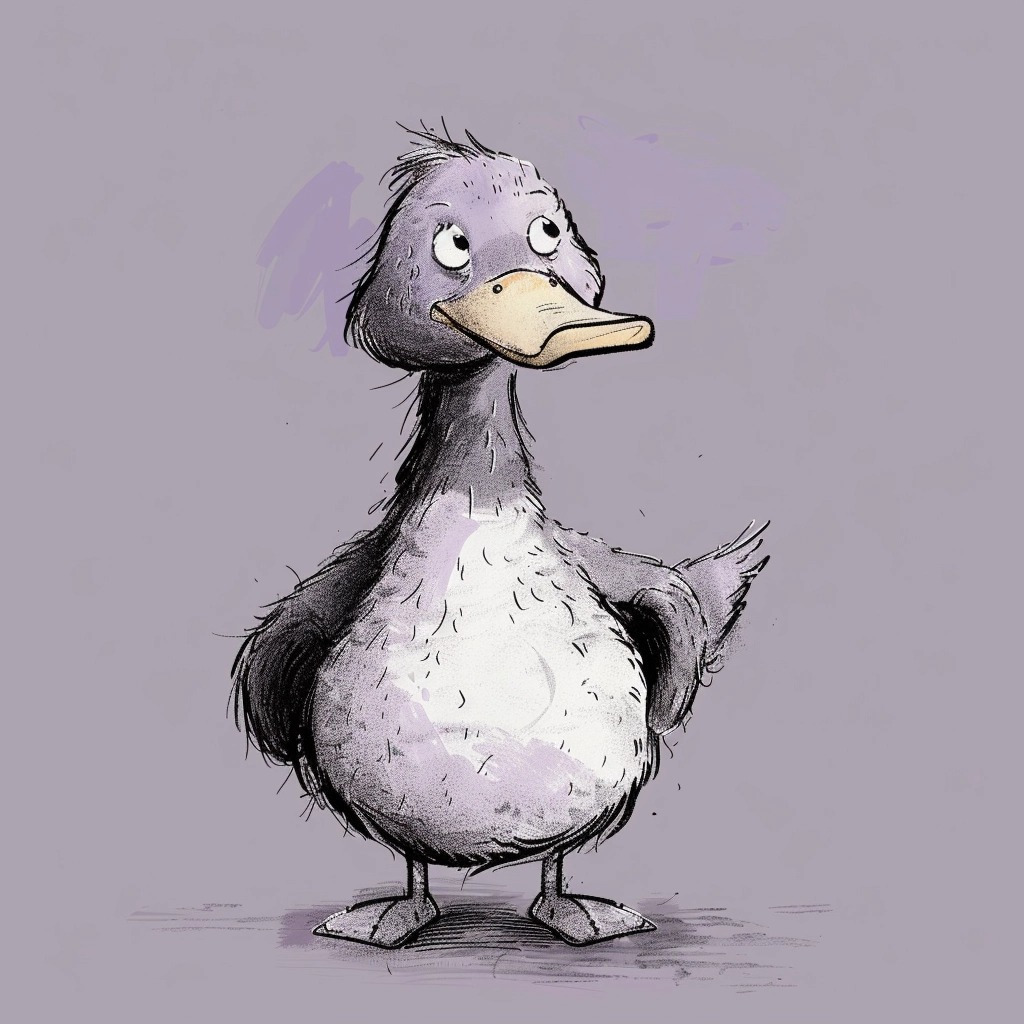 Texture Character illustration of duck, Naïve drawing, Whimsical anime, Black, White, and Gray, Light purple background