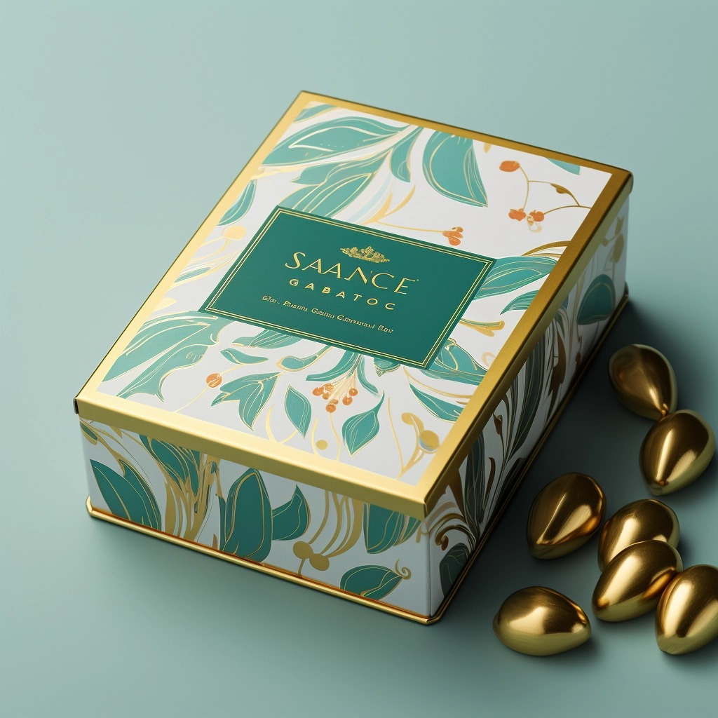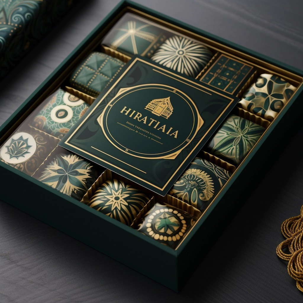 Design a package for Confectionery in a Craftsman style inspired by the art of HBA International, Green and gold color scheme