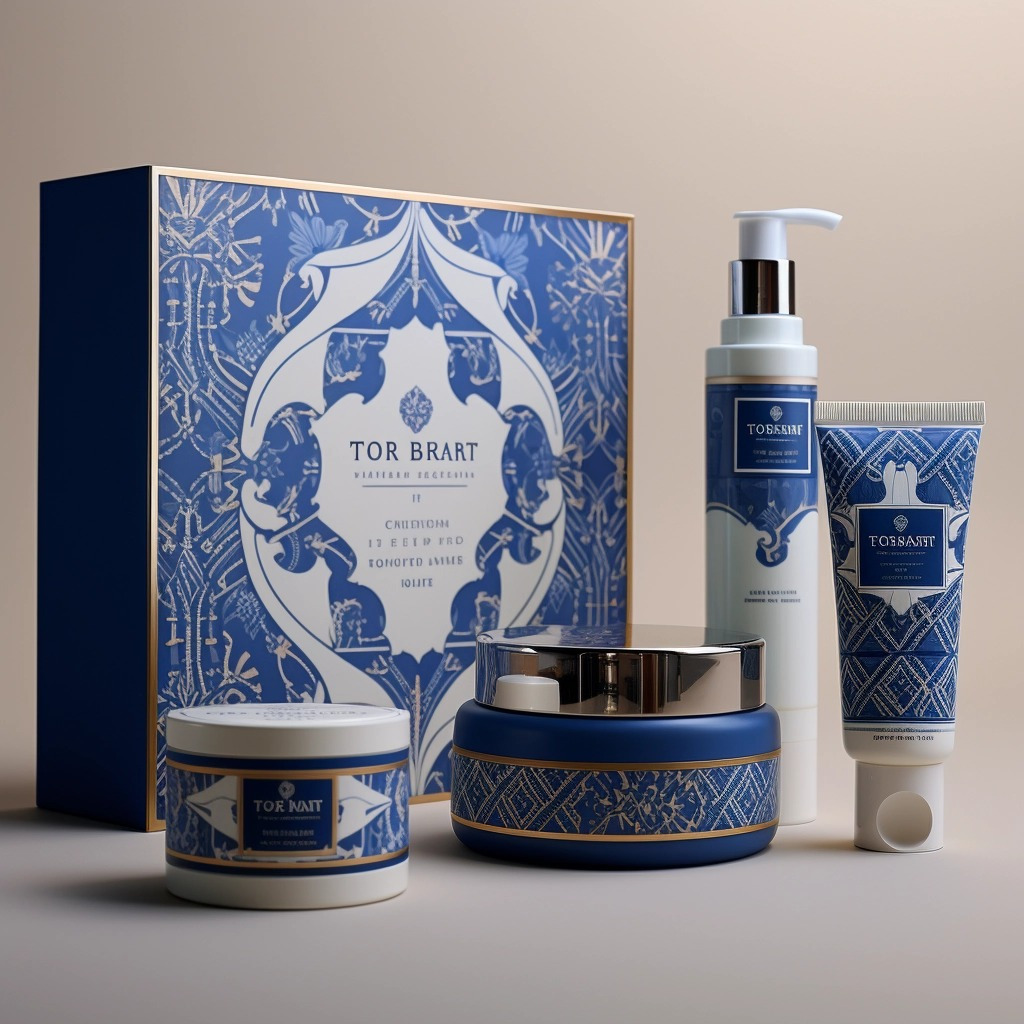 1. 화장품 제품 디자인: Design Cosmetic in a Tudor style inspired by the art of Grant Wood, Blue and white color scheme
