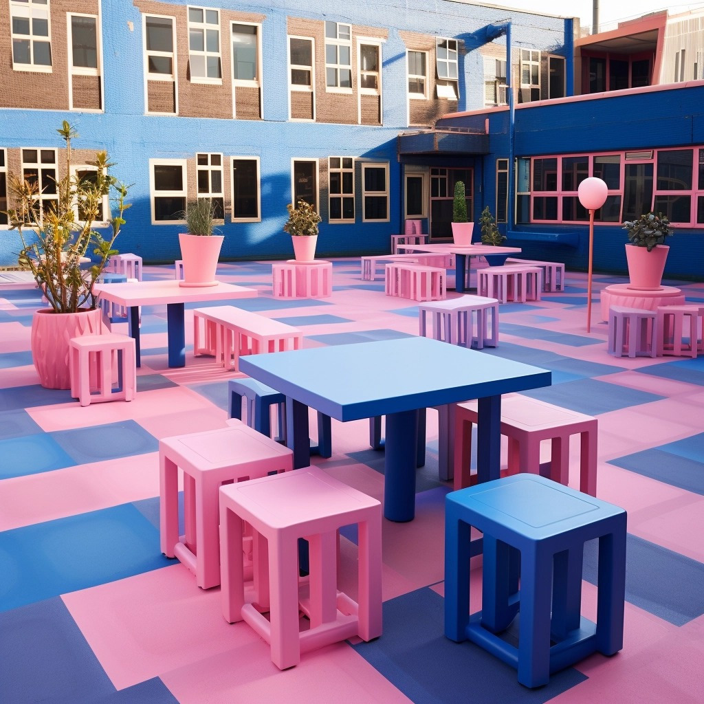 6. 실외 가구 제품 디자인: Design Outdoor Furniture in a Amsterdam School style inspired by the art of Perkins Eastman, Navy and pink color scheme