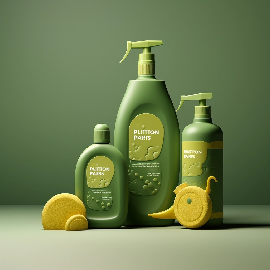 2. 청소용품 제품 디자인: Design Cleaning Products in a Photorealistic style inspired by the art of Philip Guston, Green and gold color scheme
