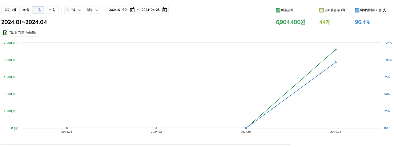 4월 1일(월) 시작해 약 한 달 동안 매출은 700만 원 정도 입니다. 1억 매출을 위해서는 월 588개를 판매해야 하며, 하루 20개 정도의 제품을 판매해야 합니다. 4월에 700만원 이상의 매출을 낼 수 있었지만 그러지 못한 이유는 바로 재고 이슈 때문입니다. 생각보다 빠르게 1차 재고가 모두 소진된 상태라, 2차 재고가 입고되길 기다리고 있는 상황입니다. 이 정도 속도라면 월 1억 매출 달성이 충분히 가능할 것이라 생각됩니다.