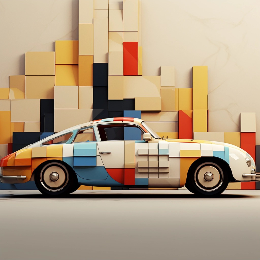 Design automobile in a Deconstructivism style inspired by the art of Piet Mondrian, Desert colors color scheme (피에트 몬드리안의 예술에서 영감을 받은 해체주의 스타일의 자동차 디자인, 사막 색상 색상 구성)