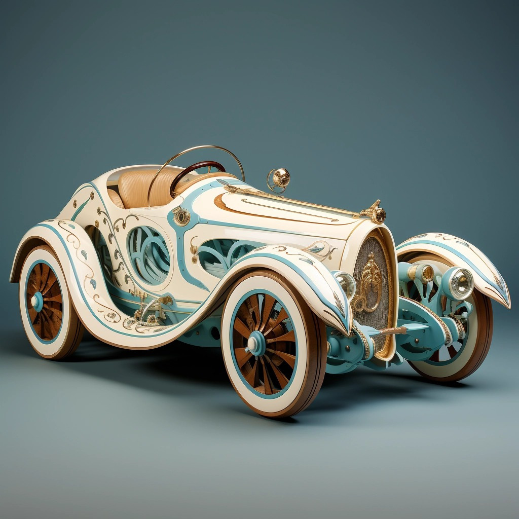 Design automobile in a Art Nouveau style inspired by the art of Grant Wood, Azure and sand color scheme (Grant Wood에서 영감을 받은 아르누보 스타일의 자동차 디자인, 아쥬레 및 모래 색상)