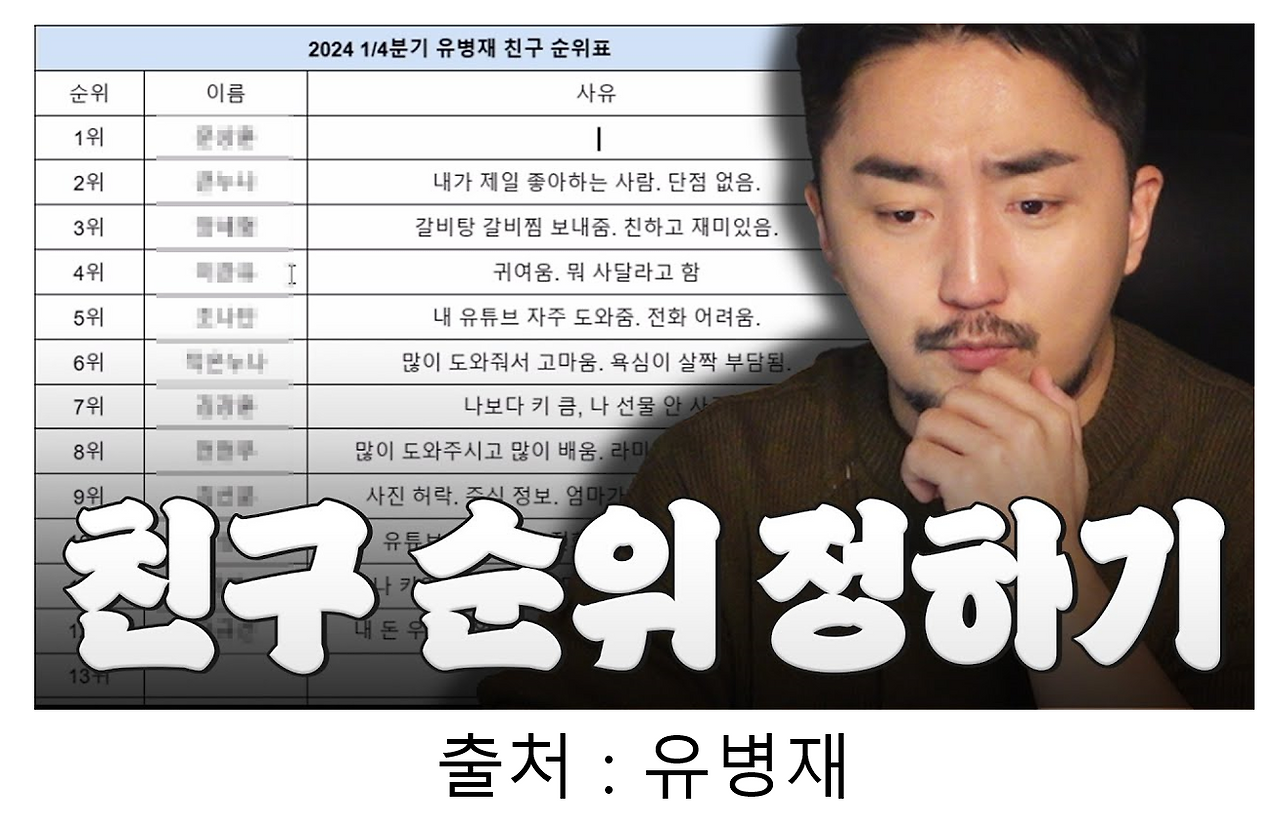 이러한 영상들 중에선 특히 유병재님의 '친구 순위 정하기' 영상을 추천드리는데요. 이 영상에선 "유병재님이 친구가 없어서, 가족까지 순위 내에 넣는 게 너무 웃기다"라는 댓글이 있죠.