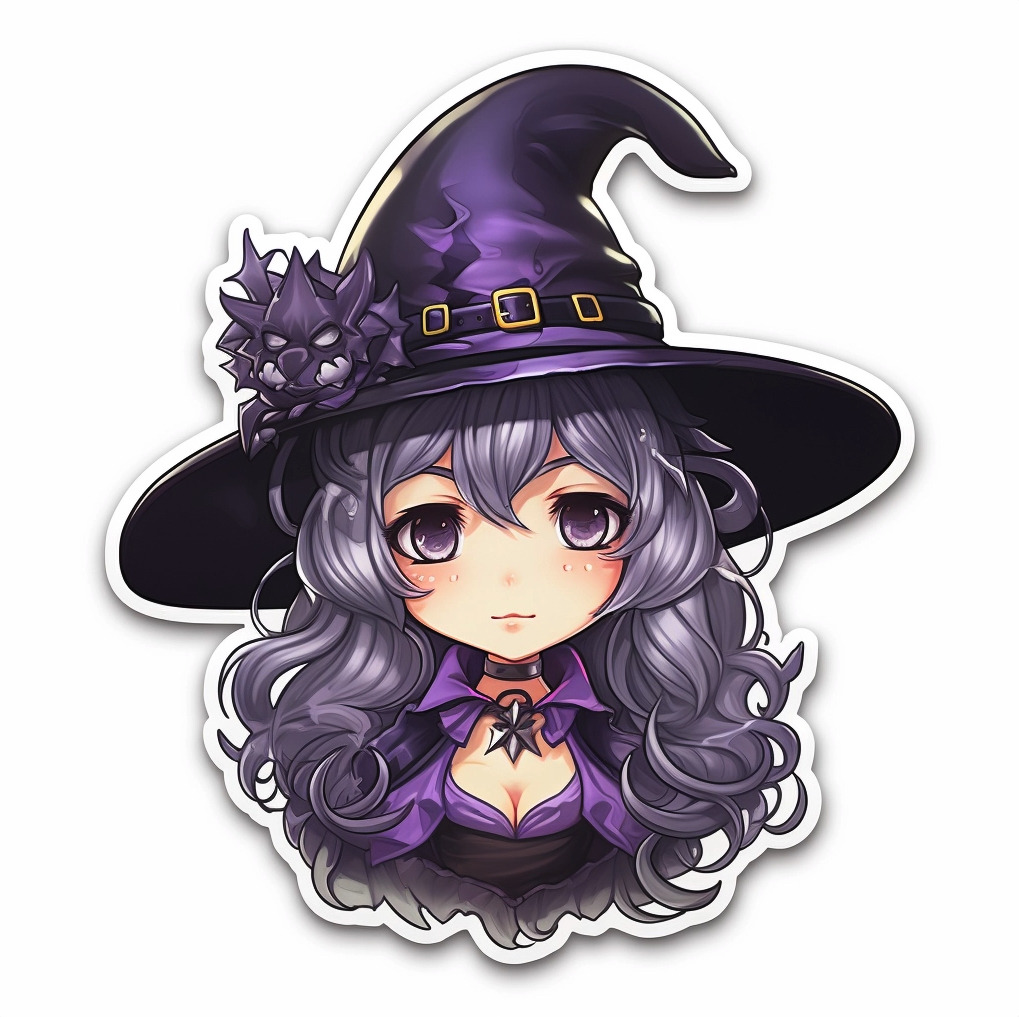스티커 디자인 7. Sticker of witch, Inventive character designs, Pop kei, Purple, Black, and Silver, White background