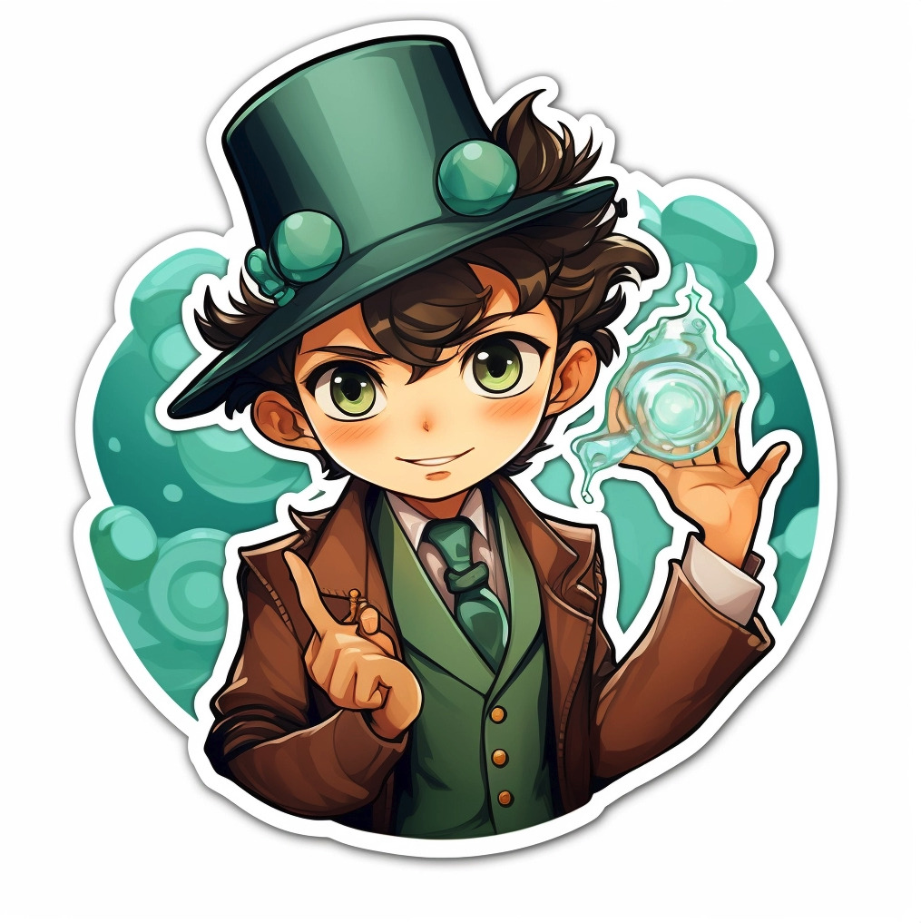 스티커 디자인 1. Sticker of magician, Eye-catching, Whimsical anime, Sea Green, Sky Blue, and White, Burnt umber background