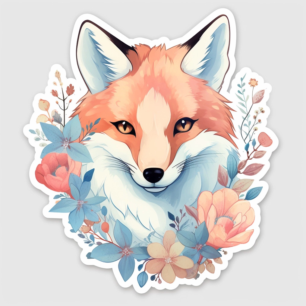 스티커 디자인 3. Sticker of fox, Raw character, Flower and nature motifs, Pastel Pink, Pastel Blue, and White, Light yellow background