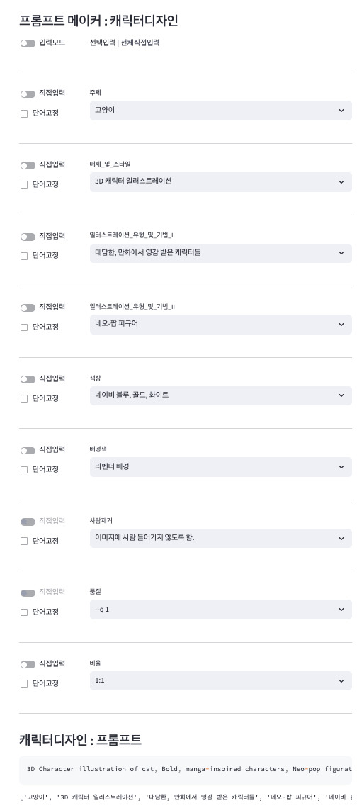 또한 직접 입력을 선택해서 한글을 넣으면 영문 프롬프트로 번역되며, 자동생성 버튼을 눌러서 무작위로 프롬프트를 생성할 수도 있습니다.