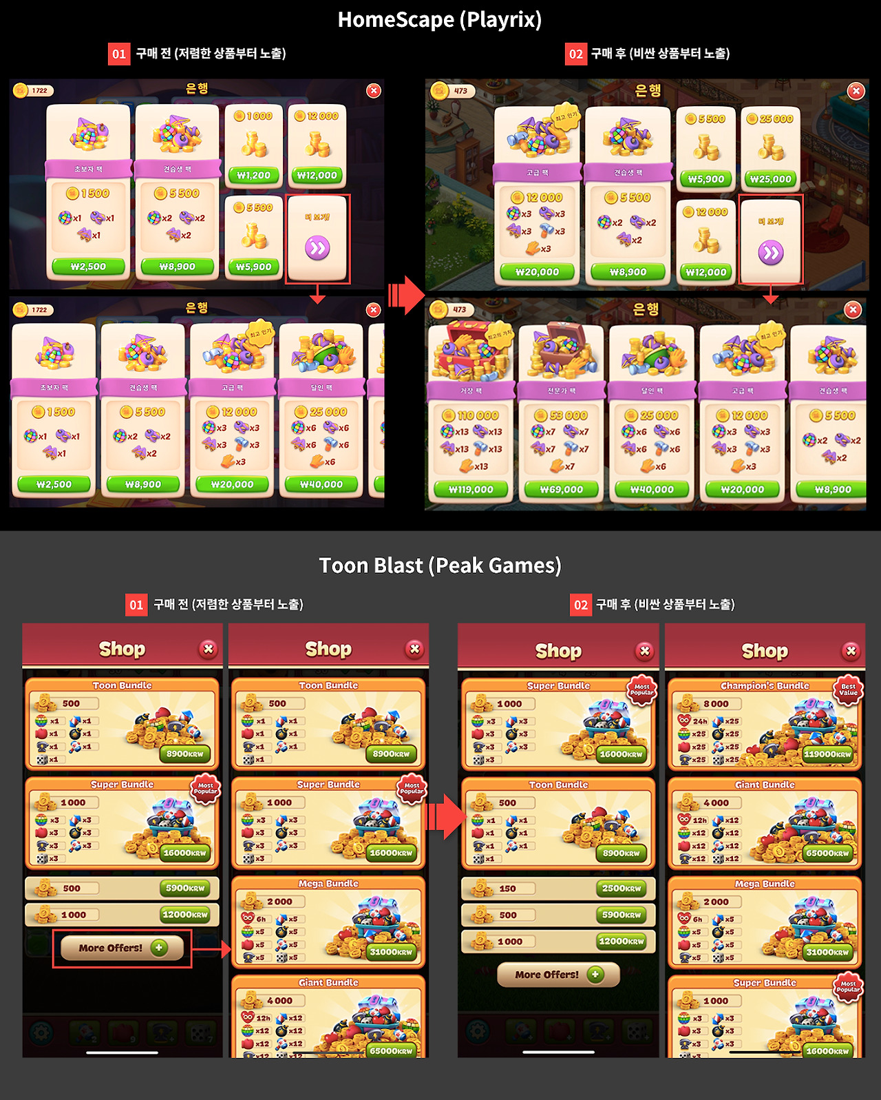 모바일 게임에서도 닻 내림 효과가 의도된 디자인 사례를 찾을 수 있습니다. Homescape를 비롯한 Playrix사의 3 match 퍼즐 시리즈와 Toon Blast(Peak Games)에서는 유저가 상품을 구매했느냐 구매하지 않았느냐에 따라 상점 팝업에서 상점을 정렬하는 기준이 달라집니다. 아직 매장에 입장하지 않고 입구 주변을 기웃거리는(상품을 최초 결제하기 전) 유저에게는 최저가 기준의 닻 내림 효과로 최초 결제를 유도하고, 이미 입장하여 자리에 앉은(상품을 최초 결제한 후) 유저에게는 최고가 기준의 닻 내림 효과로 더 비싼 상품의 결제를 유도합니다.