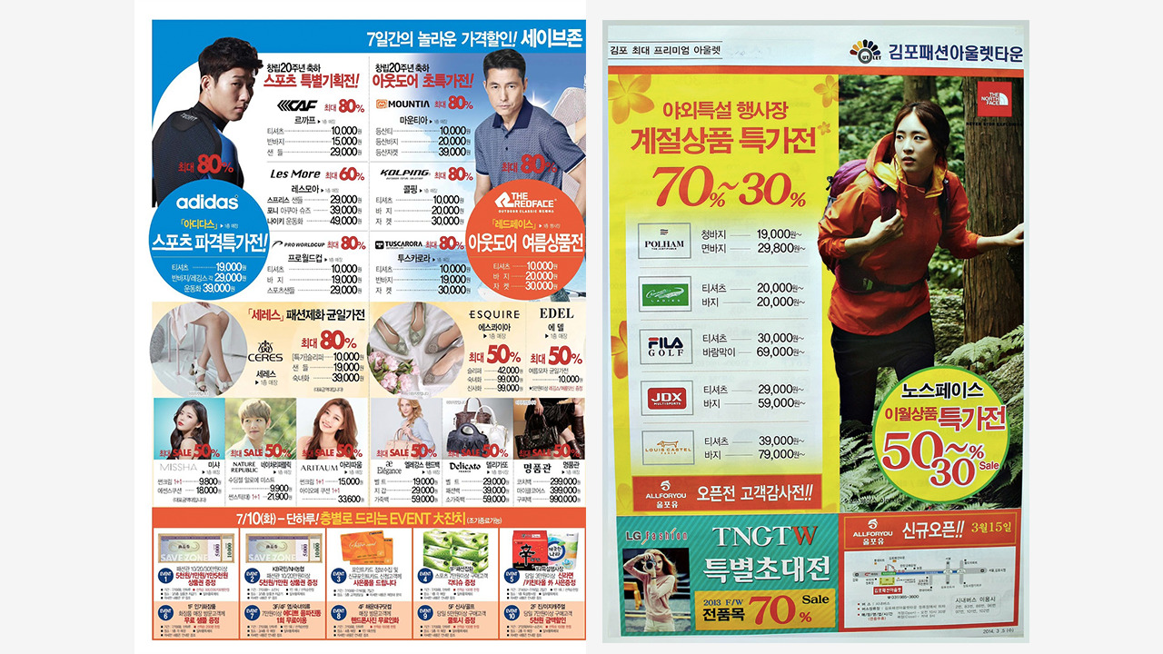 실생활에서 닻 내림 효과의 사례는 크게 두 가지 타입으로 나눌 수 있습니다. 첫 번째는 최저가 기준점의 닻 내림 효과입니다. 먼저 의류 매장의 할인 전단을 떠올려 봅시다. 전단에서는 대체로 말도 안 되게 할인율이 높은 의류 상품이나 브랜드를 시각적으로 가장 잘 보이도록 크게 강조하여 보여줍니다. 그리고 그보다 조금씩 비싸거나 할인율이 낮은 상품들을 순차적으로 약하게 보여주죠. 고객은 ‘이 브랜드(상품)의 할인율이 나머지보다 크네‘’라는 생각을 하게 되고, 이로 인해 매장을 방문할 가능성이 높아집니다(방문할 때까지 상품이 남아 있을진 모르겠지만..).