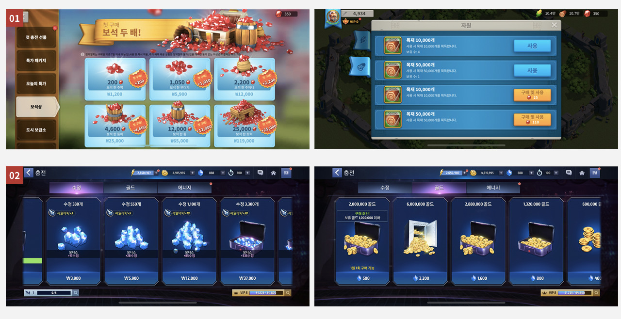 모바일 게임 시스템 내에서 재화는 크게 크리스털 류[3]의 1차 재화, 코인류의 2차 재화로 구분할 수 있습니다 [4]. 유저는 앱 내 구매를 통해 1차 재화를 획득해서 다시 2차 재화를 구매한 뒤 이 2차 재화로 캐릭터를 성장시키고 장비를 강화하거나 각종 아이템을 구매합니다. 혹은 1차, 2차 재화로 각종 가챠 콘텐츠를 구매하는 데 사용하기도 합니다. [5]