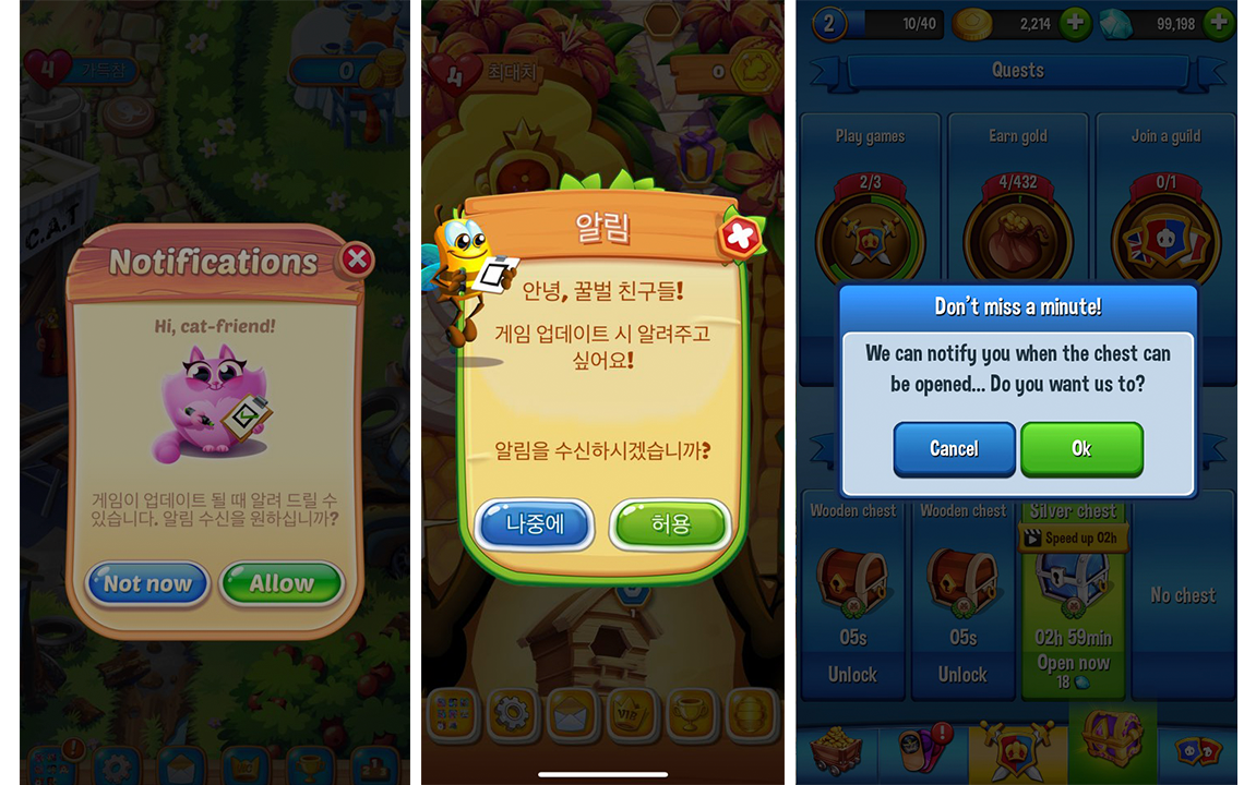 - 유저가 기분이 좋은 시점(혹은 필요하다고 느끼는 시점)을 의도하여 알림 설정 팝업을 요청합니다. Voodoo나 Tactile Games의 사례는 유저가 특정 시점의 레벨을 클리어하여 성취감을 느끼거나 첫 플레이 보상을 획득해서 긍정적인 감정을 느끼는 시점에 허용 팝업을 노출합니다. Flare Games는 여기서 한발 더 나아가 보상 상자 시간 알림과 같이 알림을 설정하면 유저 입장에서 이득이 될 수 있는 특정 시점에 요청합니다.