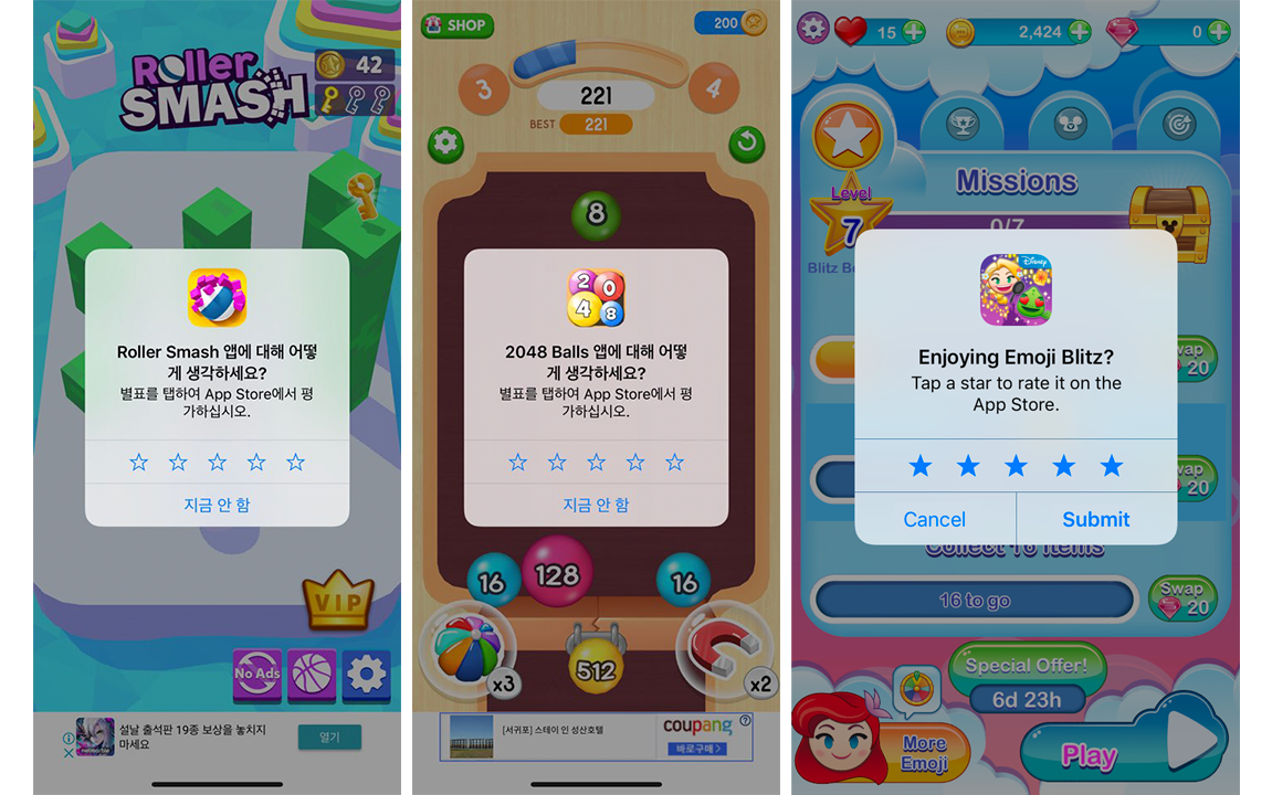 유사한 방식으로 유저의 의사결정을 이끌어내는 또 다른 사례가 있습니다. 바로 별점 요청 팝업의 사례입니다. 앱과 게임의 별점, 리뷰 등은 개발사 입장에서 유저의 반응을 정량-정성적으로 파악할 수 있는 좋은 도구이고, 스토어 피쳐드(store featured)나 설치 전환 개선을 위해 잘 관리해야 하는 제품의 요소입니다. 반대로 유저 입장에서는 앱과 게임을 설치할지 말지 판단하는 기준이 됩니다.