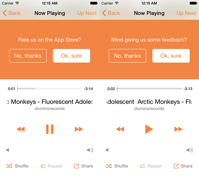 Musi를 처음 브런치에서 소개했던 2016년[2]에는 독특한 사례였지만, 지금은 굉장히 일반적인 평점 요청 경험이 되었습니다[3]. Musi는 사용자가 음악을 들으며 만족감을 느낄 수 있는 특정 시점을 예상하여 트리거(Trigger)를 요청합니다 . 이 때 트리거는 두 단계로 구성되어 있는데, 'Not really'를 선택하여 불만이 있는 것으로 예상되는 사용자에게는 E-mail의 경로, 'Yes!'를 선택한 긍정적인 사용자에게는 스토어 레이팅-리뷰의 경로로 구분하여 요청합니다[4]. 이 사례에서는 긍정적 트리거를 분리하여 요청한 부분에 주목하겠습니다.