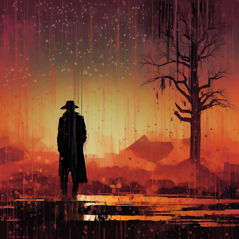 Pixel Art Illustration, rain, Dave McKean art style, Spring Palette color palette, Maroon background, Wild west desert background, Festive mood