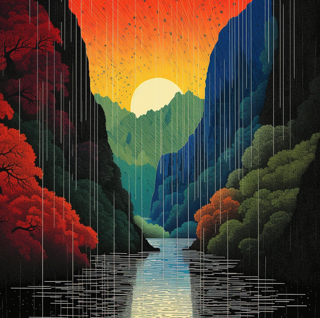 Pointillism illustration, rain, Go Nagai art style, Industrial Grunge color palette, background, River cutting through a canyon background, Imposing mood