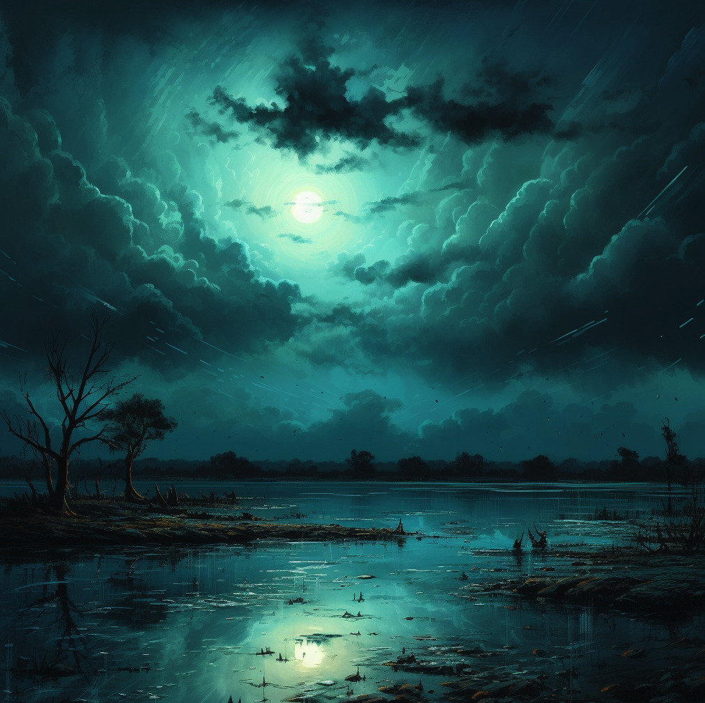 Environmental Art, rain, Jorge Jiménez art style, Metallics color palette, Turquoise background, Moonlit lake background, Desolate mood