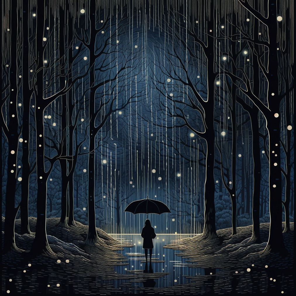 Datamoshing illustration, rain, Yuko Shimizu art style, Midnight Blue color palette, Charcoal Gray background, Dark forest background, Xenial mood