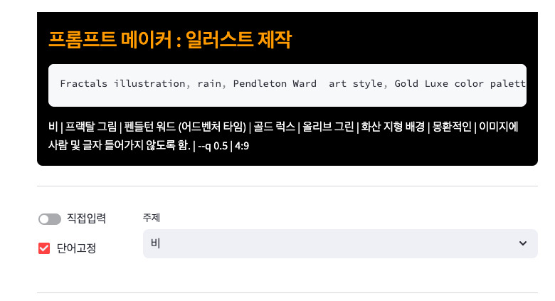 이런 프롬프트 생성의 기능을 한차원 높여서 랜덤으로 프롬프트를 생성하는 기능을 추가했습니다. 예를 들면, 주제 메뉴에서 "비"라는 아이템을 선택해서 고정시키고,