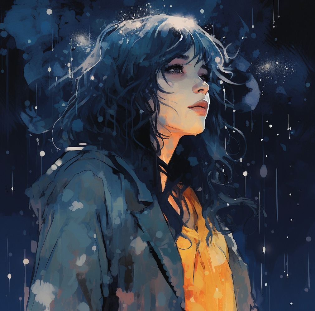 Fashion Illustration, rain, Satoshi Kon art style, Faded Memories color palette, Slate Blue background, Galaxy nebula background, Sinister mood