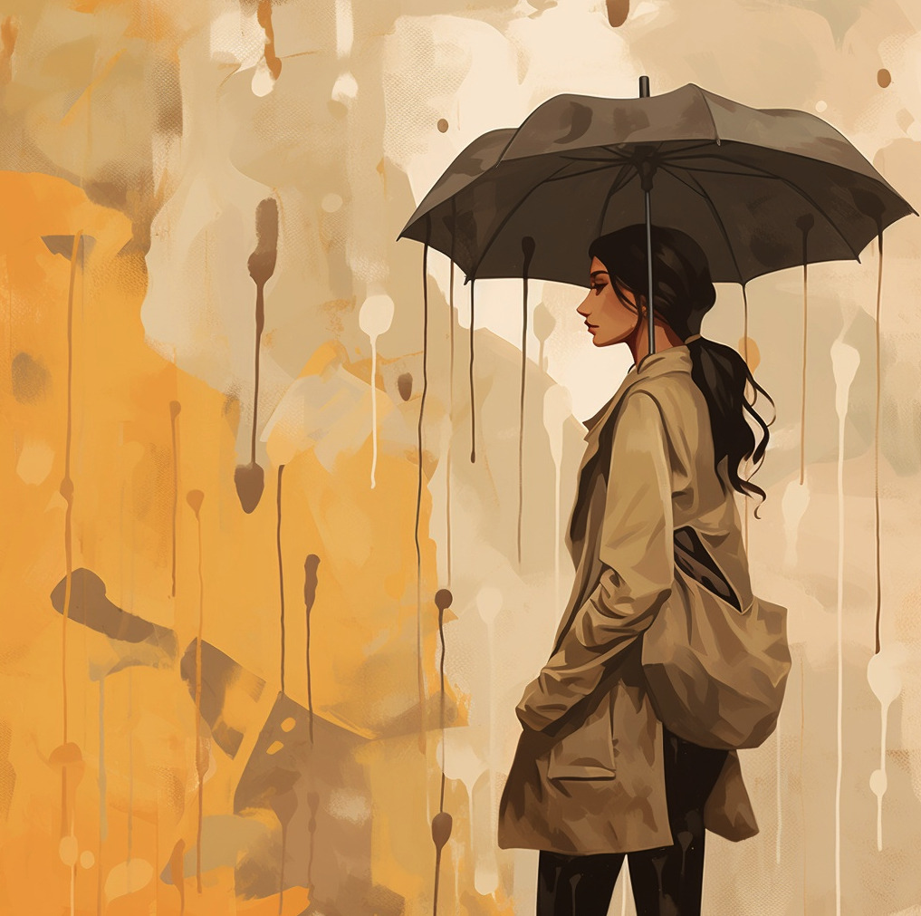 Comic Book illustration, rain, Lorena Alvarez art style, Earthy Ochres color palette, Mocha background, Faded mural wall background, Organic mood