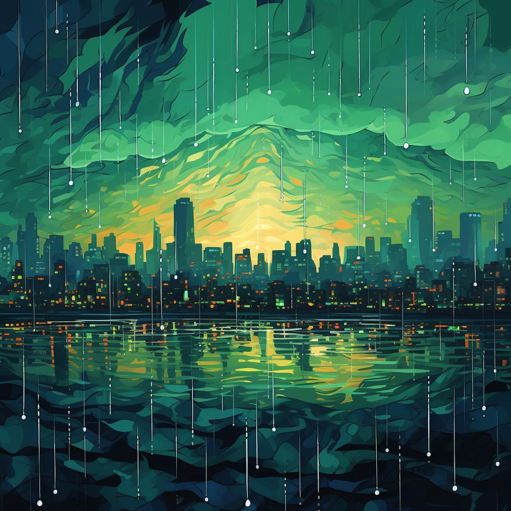 Impressionism illustration, rain, Lorena Alvarez art style, Electric Charge color palette, Emerald Green background, Panoramic skyline at twilight background, Cozy mood