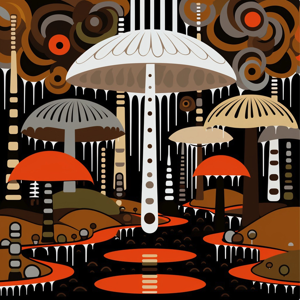 De Stijl illustration, rain, Mike Allred art style, Thunderstorm Grays color palette, Chocolate Brown background, Giant mushroom forest background, Meditative mood