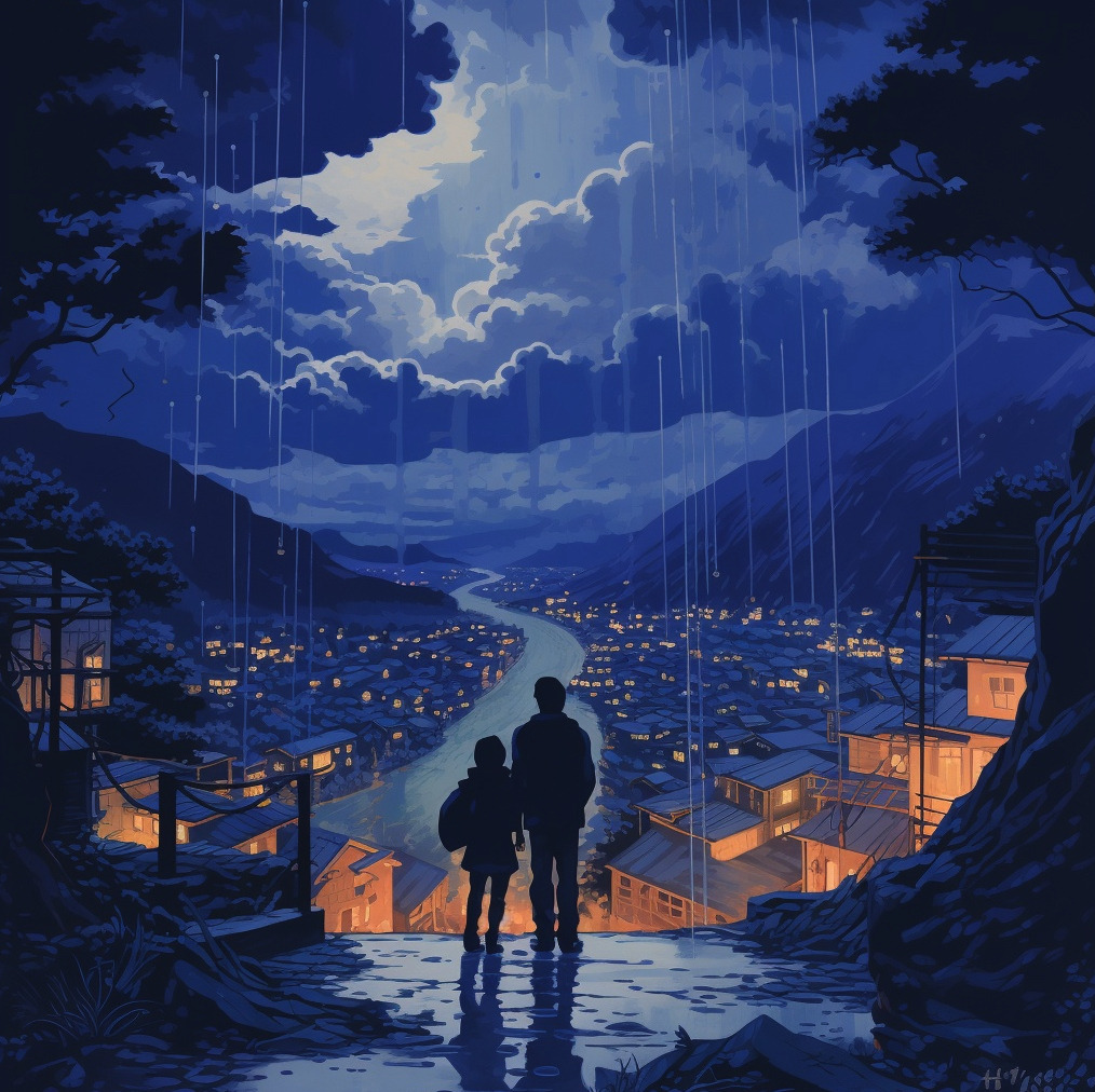 Book Illustration, rain, Satoshi Kon art style, Midnight Blue color palette, Midnight Blue background, Mountain pass background, Compassionate mood