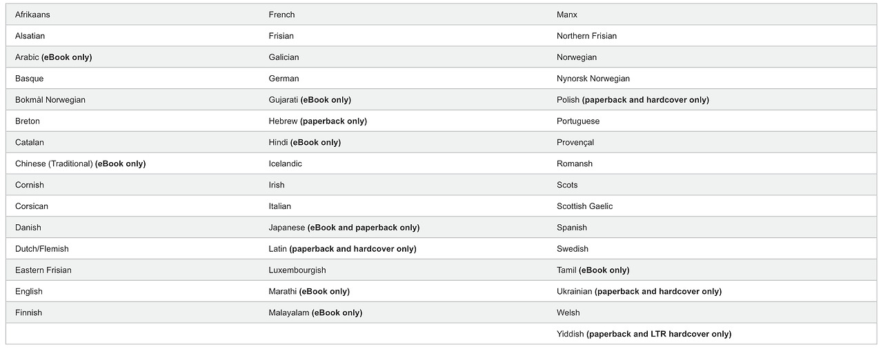 아래는 아마존 사이트에 올라와있는 아마존 출판 가능한 언어 목록입니다.