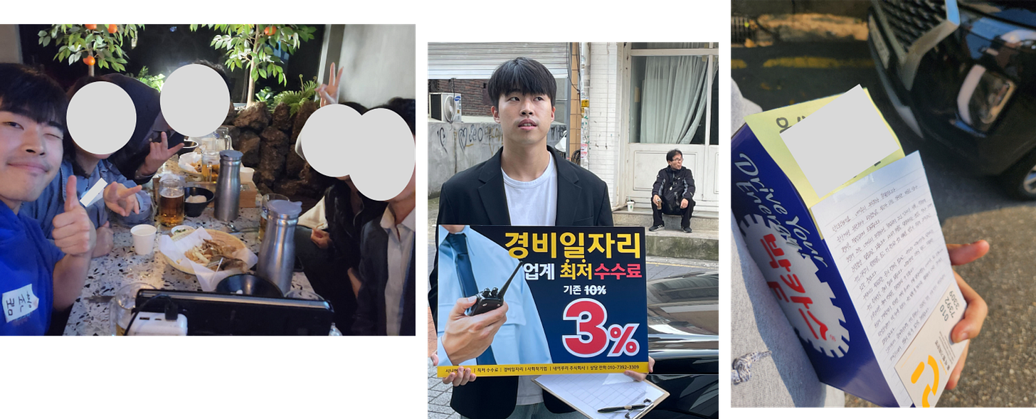 (왼쪽부터) 아파트 관리자 모임에서 / 냅다 경비 학원 앞으로 달려가서 사람들 만남 / 열심히 자필로 쓴 손편지와 선물로 드린 박카스